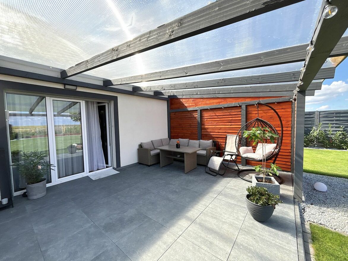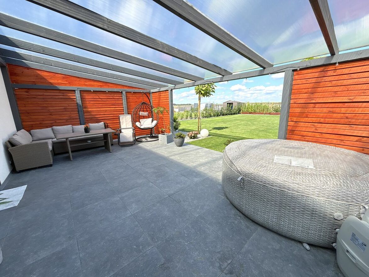 Przed domem stoi garaż na dwa samochody i jest miejsce do parkowania 3. Na tarasie jest jacuzzi, zestaw wypoczynkowy i grill, to wszystko jest zadaszone.