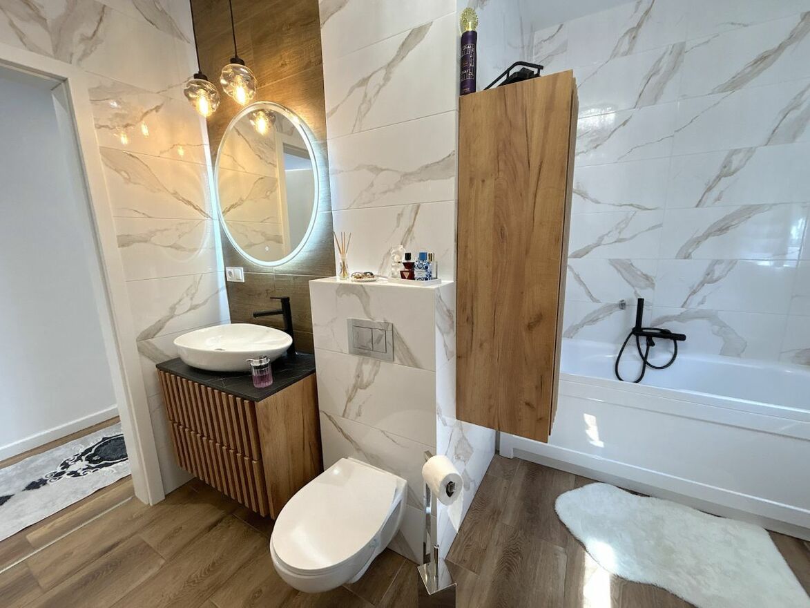 W okolicy dominuje zabudowa niska, jednorodzinna. Dostępne media, woda, kanalizacja, prąd, oraz internet po kablu. Ogrzewanie pompą ciepła. Dom jest bardzo dobrze ocieplony dlatego wydatki na ogrzewanie nie są duże. Na dachu jest dachówka ceramiczna, przed domem jest zrobiona kostka. W środku jest klimatyzacja, system kamer, rolety zewnętrzne - wszystko sterowane telefonem, kamery z systemem powiadomienia na telefon, jest system nawodnienia, Brama wjazdowa firmy Somfi - wszystko jest podłączone do funkcji smart home i można tym sterować zdalnie.